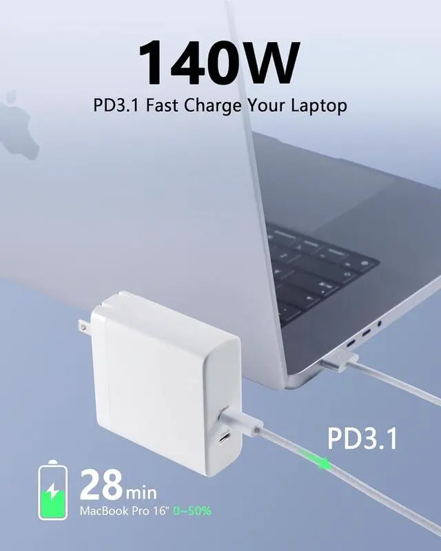Fast Charge: The ZeitNah 140W USB-C Charger is made with PD 3.1 technology in both Port type-C1 and C2, which let you enjoy fast charge with power max up to 140W by EITHER Type-C1 OR Type-C2. You could have your MacBook Pro charged from 0% to 57% in 30 min, but please make sure you use the right cable which is preferably for MagSafe 3 to USB-C Cable.
