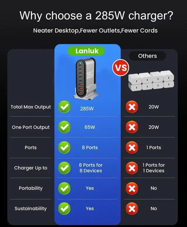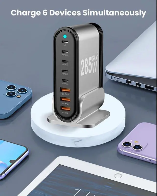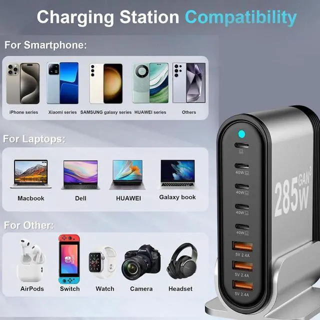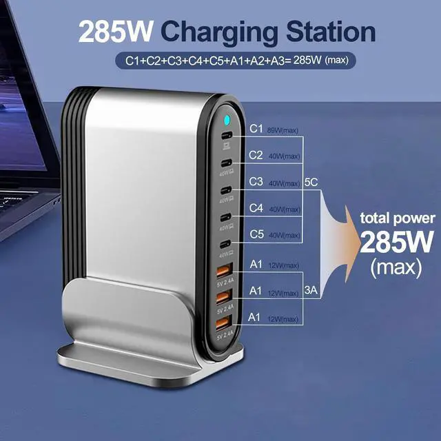 MULTI PORTS USB C CHARGER BLOCKUSB C charger block comes with 8 charging ports, USB and USB-C ports, compatible with various electronic devices. Its total output power is up to 285W, which can support high-speed charging for multiple devices at the same time, allowing you to enjoy a more efficient charging experience