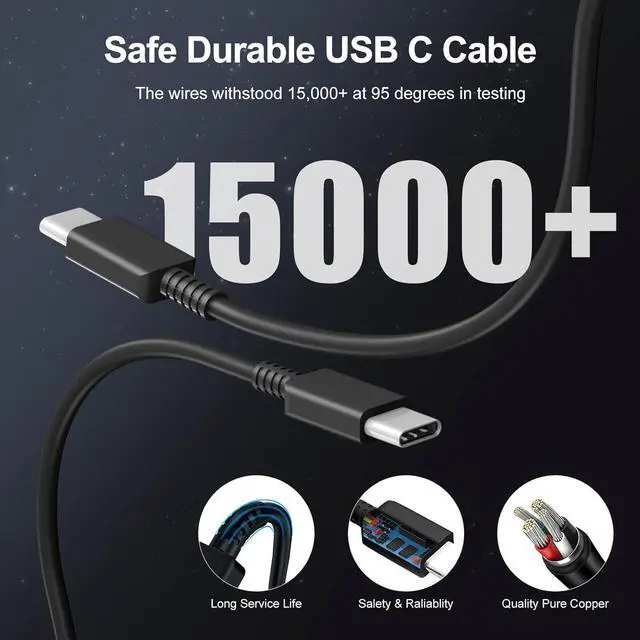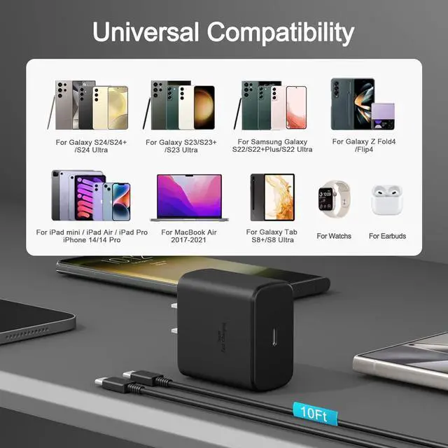10FT Type C Charger Cable Fast ChargingThe 45W USB C Compatible with Samsung galaxy s25 ultra super fast charger is equipped with extra longer 10FT Type C to C cable, offering a user-friendly reversible design and longer charging distance.