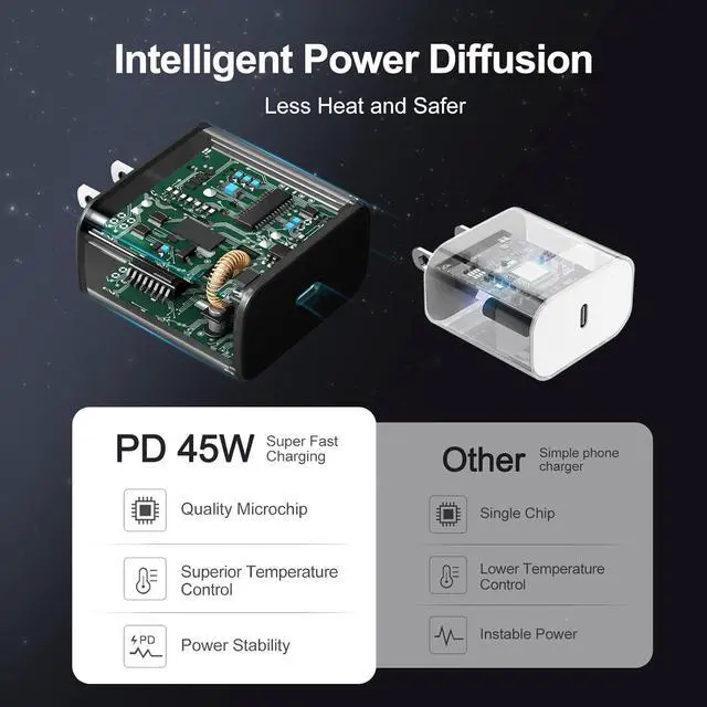 45W Compatible with Samsung Fast Charger: 45W USB C Compatible with Samsung charger uses Power Delivery technology to provide the most efficient charging. Charge your Galaxy S24/S23/s22 Ultra from 0% to 50% in just 20 minutes, faster than other 25W/15W chargers