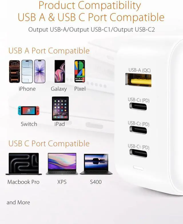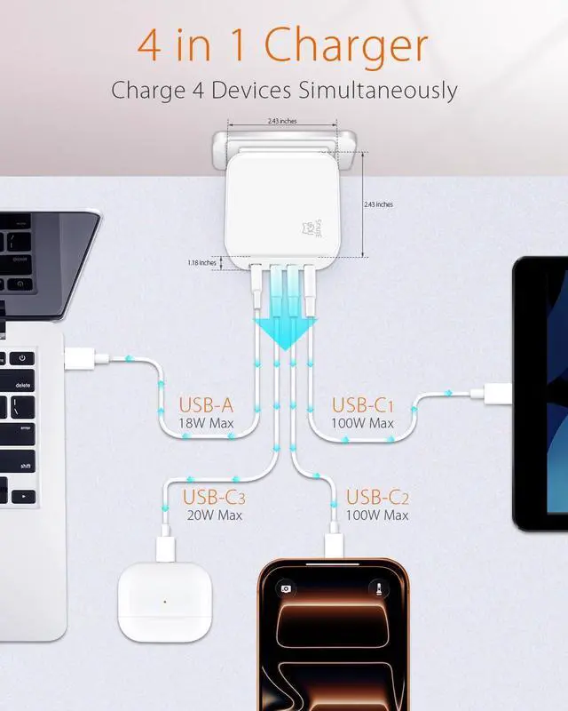 4-port Efficient Charger3inuS USB C Mutiport Laptop Charger with 3 x USB-C Port and 1 x USB-A Port provides an convenient and efficient way to charging 2 USB-C laptops and 2 smartphones simultaneously. Free your table in a minute, provide more desk space and stylish Design.