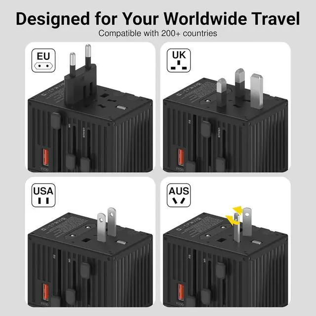 Universal Compatibility: Equipped with 4 plug types (Type C, G, I, A), covering 200+ countries and regions, making it perfect for global travel.