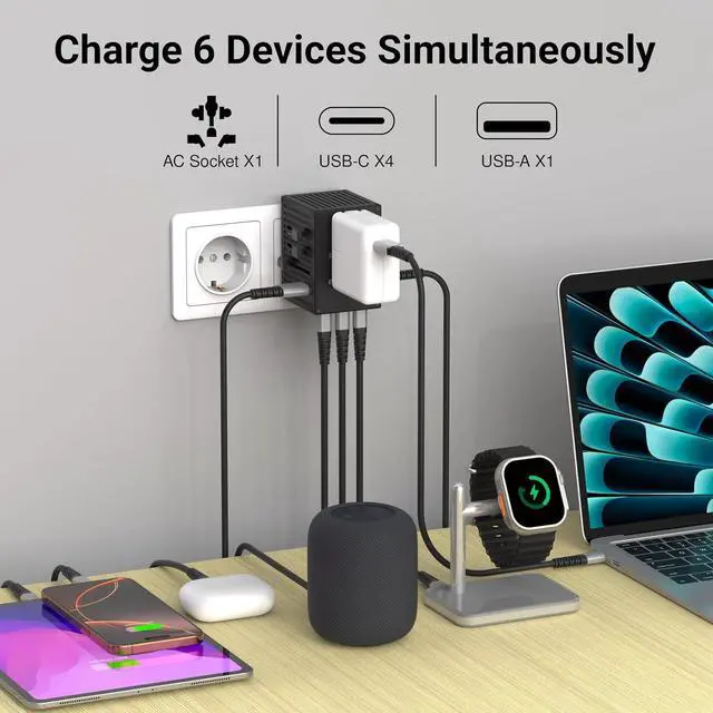Simultaneous Charging: Features 4 USB-C ports and 1 USB-A port, including a 65W USB-C PD port with intelligent power allocation for efficient, high-speed charging of multiple devices.