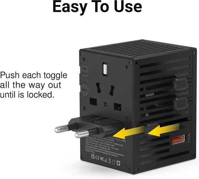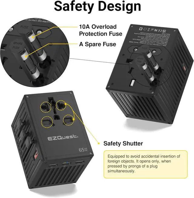 Advanced Safety Features: Includes a built-in 10A fuse (with spare), safety shutters, plug lock system, and certifications (RoHS, CE, FCC) to ensure reliable and safe use.