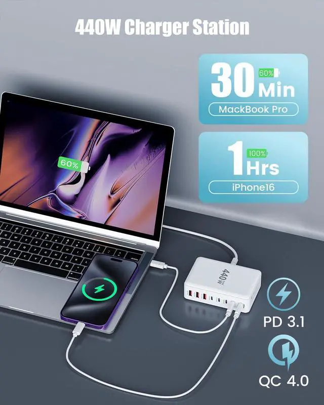 Ultra-Powerful 440W Charging StationExperience the convenience of high-speed charging for eight devices simultaneously with our potent 440W USB C Charger. Our USB C charger block with 5 USB-C ports and 3 USB-A ports, Streamlining your charging process, allowing you to power up all your devices simultaneously with ease. When a single device is connected to the USB-C1/C2 ports, it enjoys an impressive charge of up to 100W.