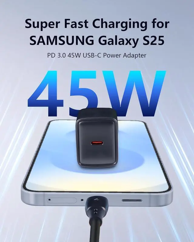 Super Fast Charger: This 45W USB-C Charger supports supper fast charging for SAMSUNG Galaxy S25/S24/S23. You could have your phone charged up to 50% in 20 minutes. It also fits for iPhones and other smart phones fast charging.