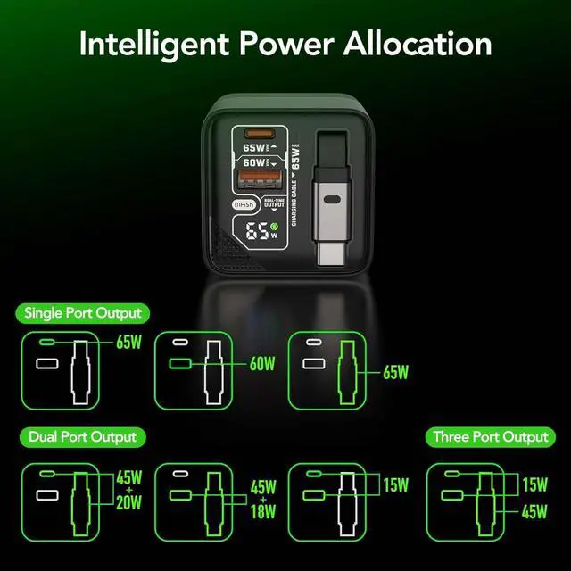 Dual-Port Output: USB-C + USB-A Charge two devices at oncelaptops, phones, tablets, and morewith 65W max output via USB-C and 18W via USB-A. Supports Power Delivery (PD) and Quick Charge (QC) protocols.