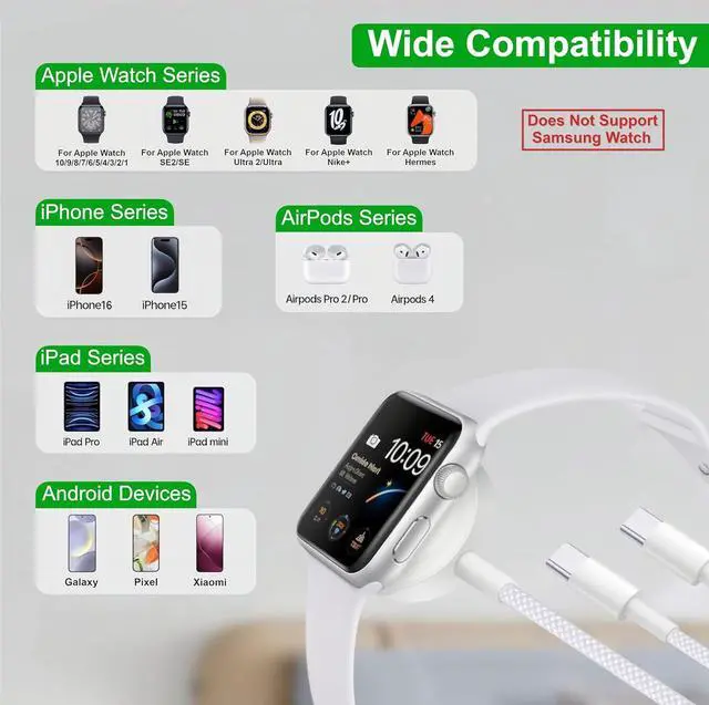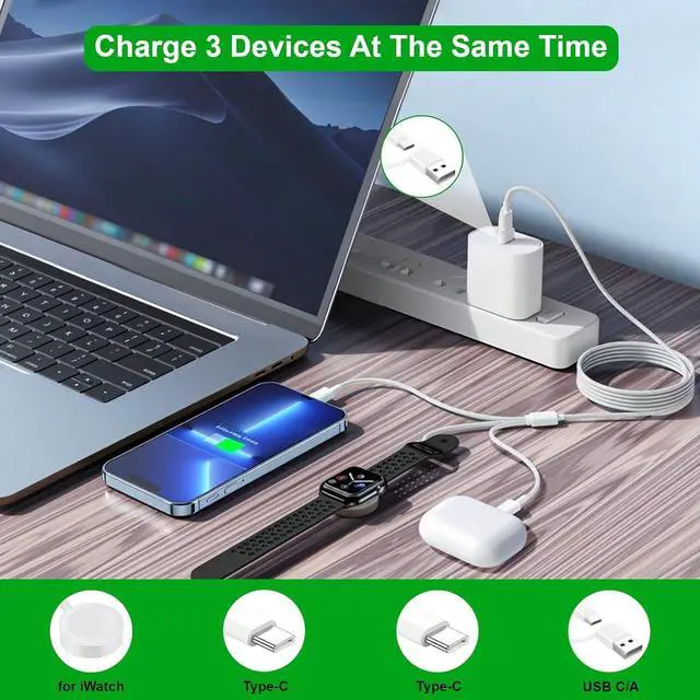 ??????????????????????????????????? Our multi charger for devices designed for Watch Ultra 2/Ultra/SE 2/SE/10/9/8/7/6/5/4/3/2/1 iPhone 16/16 Pro/16 Pro Max/16 Plus iPhone 15/15 Pro/15 Pro Max/15 Plus iPad Pro/Air/mini AirPods 4/Pro 2/Pro/Max??? -???? -???????????????????????????? For Watch and phone charger offers several charging combinationsUSB C/A to iWatch charger and USB-C/A to two Type C cables.