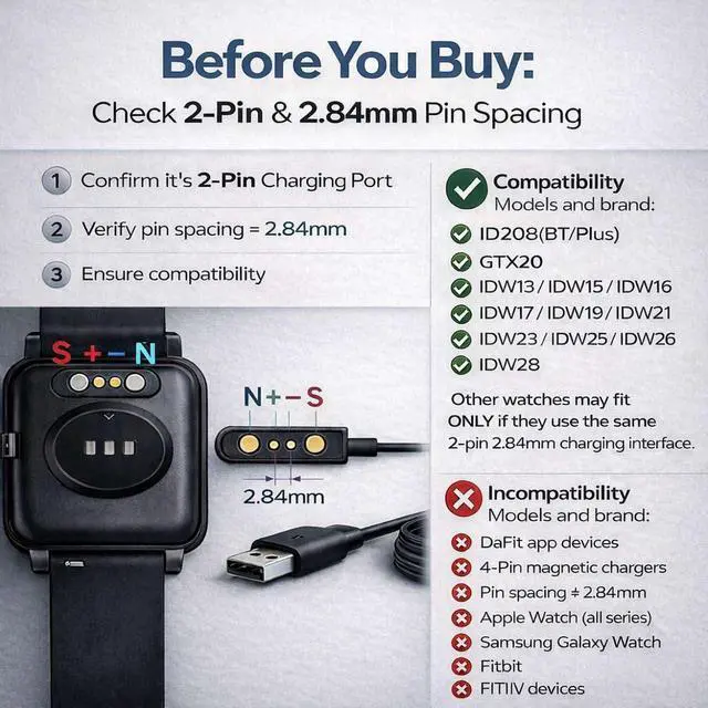 ? Fit for VeryFit / VeryFitPro Models ( 2.84 mm 2-Pin): Compatible with VeryFit app smartwatch modelsID208(BT/Plus) GTX20 IDW28 IDW26 IDW25 IDW23 IDW21 IDW19 IDW17 IDW16 IDW15 IDW13Please confirm your watch charging port is 2-pin and pin spacing is 2.84 mm before purchase.? Also Fits Some Other Brands with the Same 2.84 mm