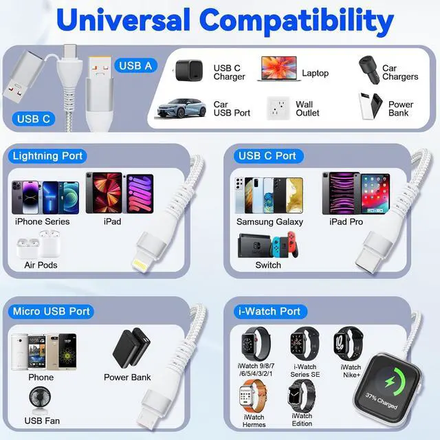 What You'll Get: We provide 10FT/3M 4-in-2 USB C/A to iWatch/Lightning/USB C/Micro USB Cable. The 10ft/3M iPhone and Watch cable accommodating different daily scenarios. It's easily storable in your travel bag best travel essentials