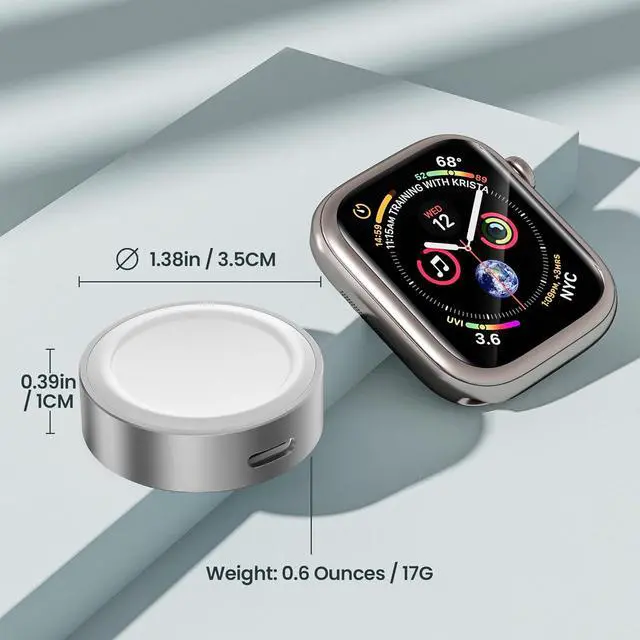 Sleek & Durable Design: Featuring a sleek round design and crafted from premium aluminum alloy this charger not only looks stylish but also offers exceptional durability. Its robust construction ensures long-lasting use making it a reliable companion for your Watch. With its compact and lightweight design ( 1.38 diameter x 0.39 height / 3.5 cm diameter x 1 cm height and weighing just 0.6 ounces / 17 grams) this charger fits effortlessly into your bag or pocket making it perfect for travel or daily commutes. Never worry about running out of battery on the go again; keep your Watch powered up wherever you are.