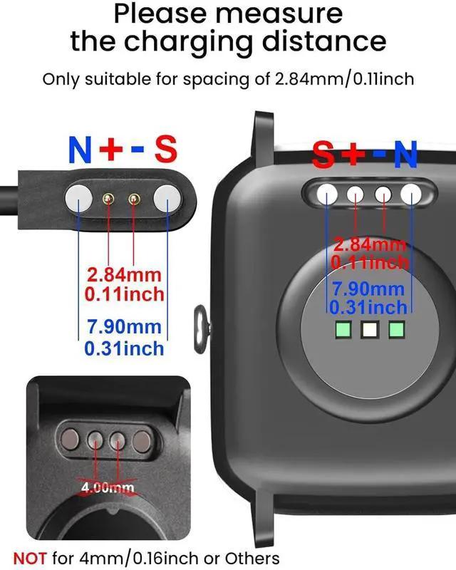 ?????? Please refer to the second picture to check the charging distance of the watch. OnIy suitable for spacing of 0.11 in( 2.84MM ). Not for 0.16 in (4MM) or others.?????? Please refer to the other pictures to check the compatible model of the watch. Only compatible with ID205LID205UID205SID205GID206ID216. Not compatible with ID205 or Other Model. NOT Compatible for MVEFOIT/KOSPET/Acclafit L51/KALINCO P22/C-Max/COSMO JrTrack 2 SE/TIMEX/VIRMEE/TickTalk 4/WZWNEER/MorePro/iTECH/Tinwoo/MyBat Pro Activate Fitness/GRV/CANMIXS/Xiaomi Haylou LS01LS02GSTLS09B/Vigorun ID216/Noise ColorFit Pro 3 Spo2ColorFit Ultra/TOZO S2/Fitniv IW1/AOKESI 1.69 /Kummel/boAt Watch Xtend/SoundPEATS Watch1/SoundPEATS/Livikey/Boean/FVYAO/Overfly/Willful ID205021SW01/Letsfit IW2ID205/YAMAY SW01021023/UMIDIGI Uwatch 5Uwatch GTUwatch ID206miniID207/Cubitt CT2Pro Smart watch.