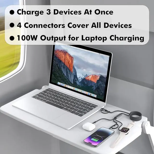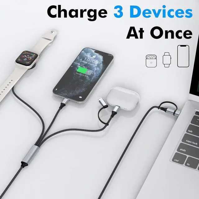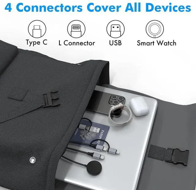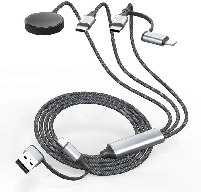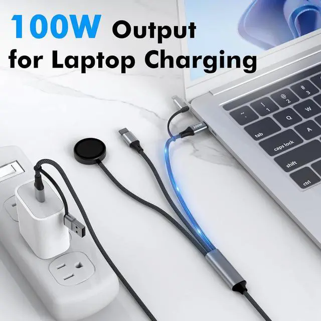 4-in-1 All-in-One CableDesigned with four built-in connectors Watch charger Lightning USB-C and Micro-USBthis versatile charging cable eliminates the need to carry multiple cables. Perfect for users with mixed + Android devices. 100W PD Fast ChargingThe USB-C output supports up to 100W fast charging ideal for quickly powering phones tablets earbuds and even some notebooks.