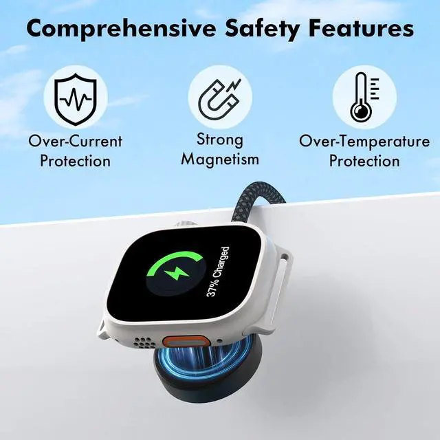 Note: Charging speed varies by device and power adapter. Wide CompatibilityFully compatible with Watch Series 110 SE/SE2 Ultra/Ultra 2. Also works with iPhone AirPods Galaxy Google Pixel Kindle Bluetooth headphones power banks and more. Durable Nylon Braided CableReinforced nylon weaving and aluminum connectors ensure excellent durability better bending resistance and a longer service life. Tangle-free and ideal for everyday use or frequent travel. Ultimate Travel-Friendly Charging SolutionLightweight compact and easy to storeperfect for travel business trips office setups hotels airports and car charging. Simplify your life with one cable that replaces an entire drawer of chargers.