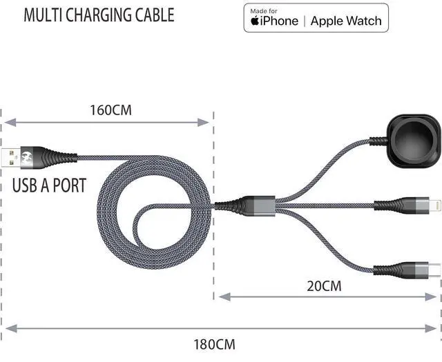 Note: Remove bulky cases for optimal speedMFI Certified Fast Charging for iPhones & USB-C Devices. Speed matters. MFI-certified multi charger cable supports USB Type C cable fast charging and USB lightning cable compatibility delivering rapid power to iPhone cable USB C cable pack and Watch. Designed as a multi charger for all devices its lightweight tangle-free and ready for travel accessories like backpacks or briefcasesCompact Travel Charger for On-the-Go Power. Stay powered anywhere with this 3 in 1 charger. Portable design fits seamlessly into travel essentials like bags and suitcases. Charge iPhone iWatch and USB A to C cable-compatible devices simultaneouslyno adapters needed. Multi charging cables nylon braided durability resists wear making it a reliable charger cable for adventures or daily commutesRugged Nylon Braided Design Built to Last. Ditch flimsy cables. Charging cord for multiple devices features nylon braided shielding and sandblasted aluminum connectors to prevent fraying and overheating. Compatible with USB A to lightning cable Type C cable and Watch charger outperforms standard TPE cables in durability. Whether you need a multiple charger cord for home or a travel accessory this multi charger cable ensures long-term reliability