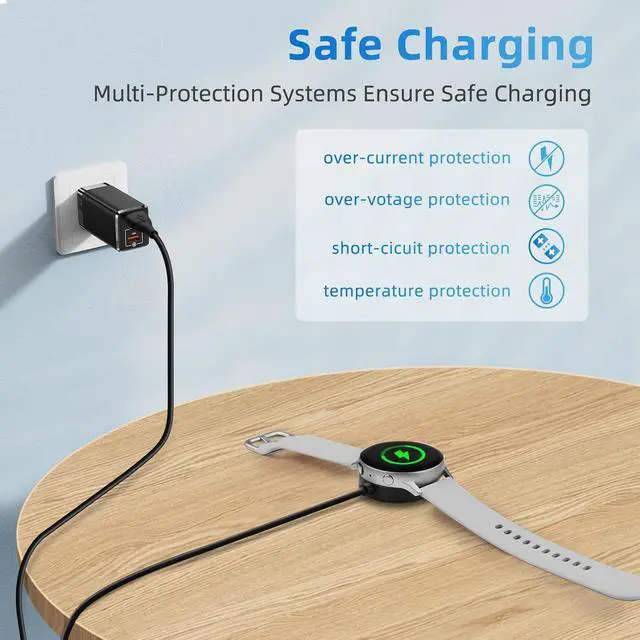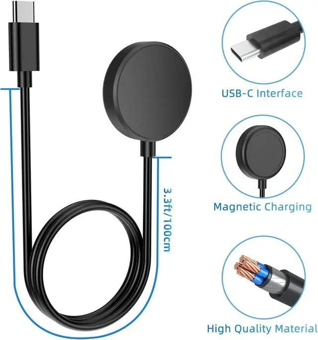 USB C ConnectorThe Galaxy Watch Charger can be plugged directly into any USB C charging port meet your different needs only needs 2-3 hours to charge your device fullyWide Compability The charger for watch is widely compatible with Galaxy Watch 6/ Watch 6 Classic/ Galaxy Watch 5 40mm 44mm/ Watch 5 pro 45mm / Galaxy Watch 4 40mm 44mm/ 4 Classic 42mm 46mm/ Galaxy Watch 3 41mm 45mm/ Active 2 / 1 compatible with all of the galaxy seires watchCompact & PortableThe smart watch charger has a lightweight and slim design it fits even in your smaller pocket. whether at home or traveling be your nice on-the-go companionDurable & SafeOver-current over-voltage short circuit and over-temperature protection chip included provides you a safe environment for charging premium material have a longer service life flexible and durableWhat You Get2 x Type C charger for Galaxy Watch