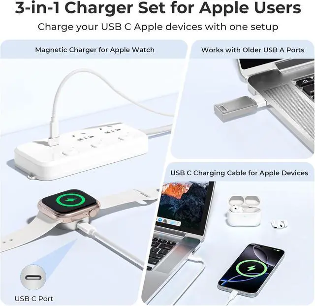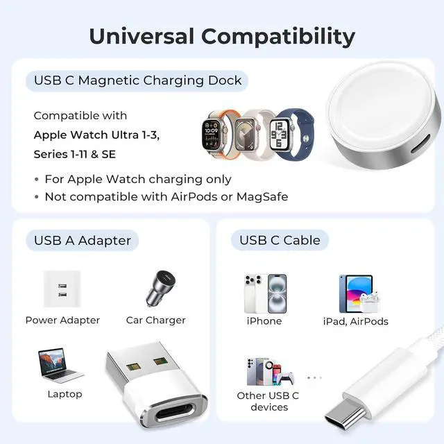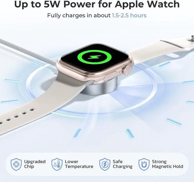 5W Fast Charging: Delivers efficient 5W power that fully charges your Watch in just 1.52. 5 hours. The upgraded chip keeps charging temperature lower and more stable protecting your devices from overheating and ensuring safe consistent performance every time. (Not compatible with non- watches.