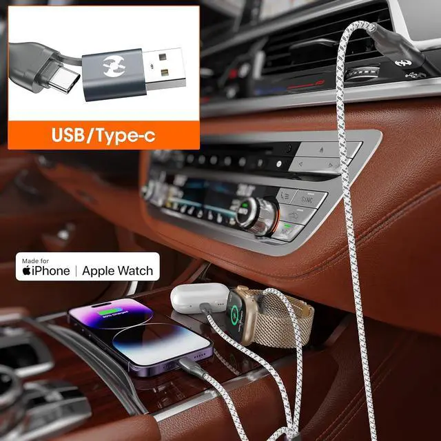 USB A port supports: Watch Charger Cable Fast Charging Cord Type C and iPhone Charging Cable (Lightning).