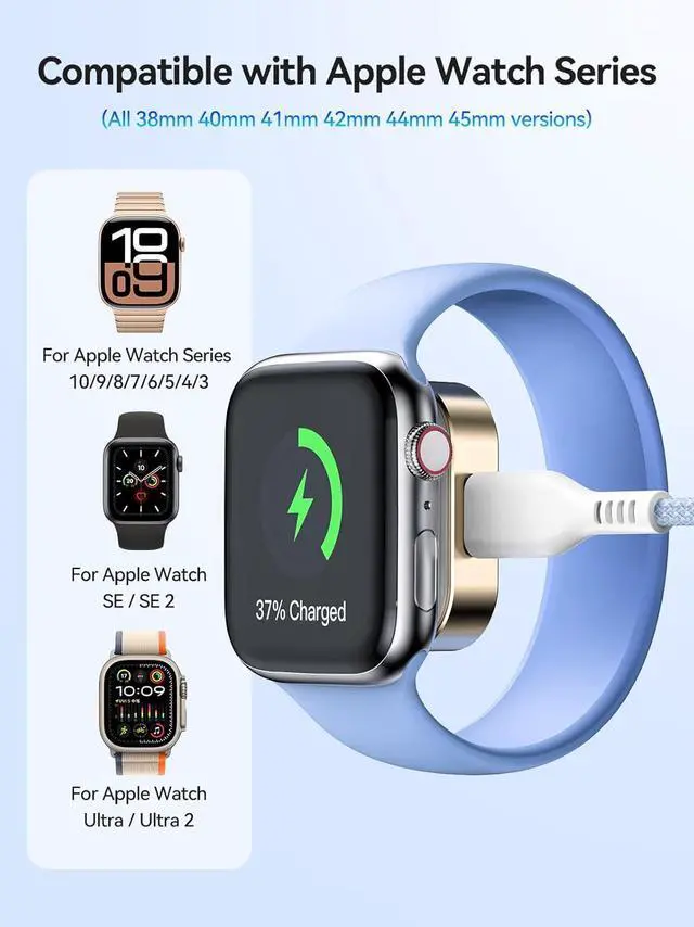 Wide Compatibility The wireless charger is compatible with watch series 10/9/8/7/6/5/4/3/SE/SE2/Ultra/Ultra2 (including the 38mm/40mm/41mm/42mm/44mm/45mm/49mm Version). The USB C port is for iPhone 16/16 Pro/16 Plus/16 Pro Max/15/15 Pro/15 Plus/15 Pro Max Galaxy Google phone and other USB C devices. Strong Magnetism & Fast Charging The watch can be adsorbed when it touches the charger. The strong magnetism ensures the watch to stay in the center of the charger and secures the watch from sliding off providing a stable charging environment for your watch. With the latest watch wireless charging chip it only takes 2-3 hours to fully charge the watch.