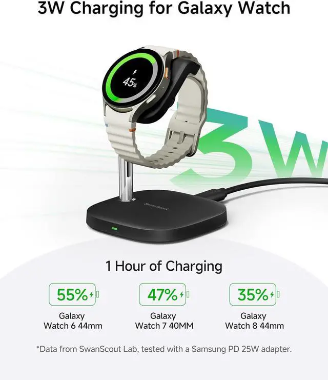 Galaxy Watch: Power up your Galaxy Watch7 44mm to 47% in just 1 hour with a consistent 3W outputdesigned for a smooth stable charging experience that fits seamlessly into your daily routineStable Charging with
