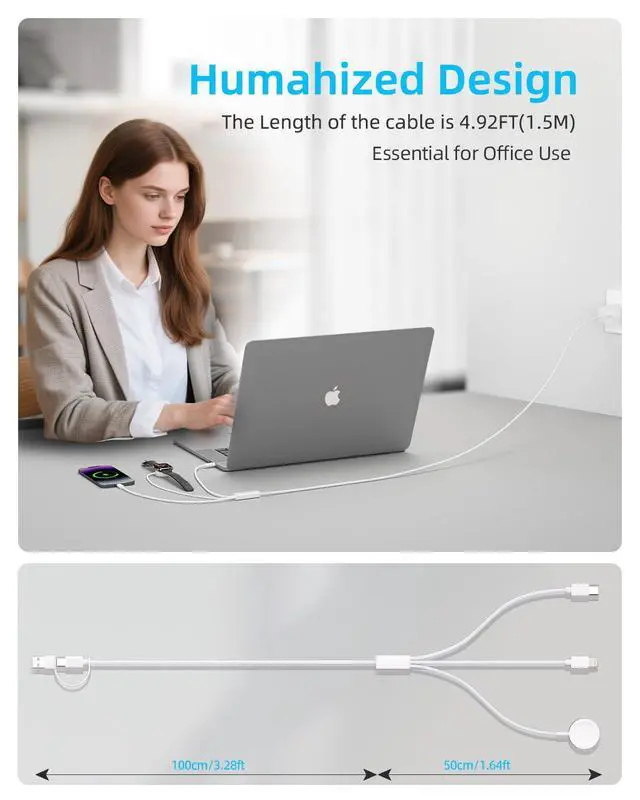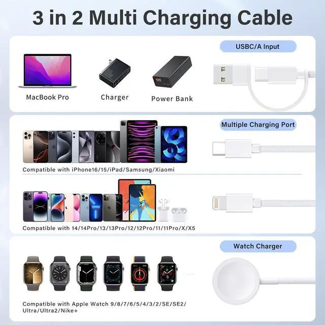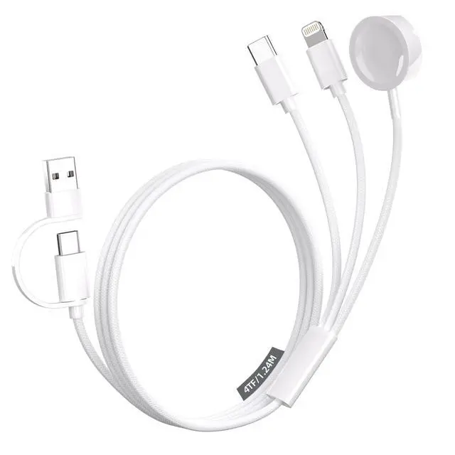 All-in-One Travel Charging Solution 6 Modes in 1 Cable This 3-in-2 USB-C charging cable combines USB-C and USB-A inputs with outputs for Watch charger Lightning and USB-C offering 6 flexible charging modes. Whether you're packing for a cruise vacation camping trip or dorm life this universal charger supports iPhone 17-12 iPads Watch Series 1-10 SE Ultra & more making it a true travel must-have and vacation essential. Portable Travel and Cruise Must-Have 4FT Ideal Length Designed with travelers in mind this 4-foot multi-charging cord fits seamlessly into any carry-on bag car accessories kit or beach backpack. Use it in your Disney World trip on airplanes in hotels or on road trips perfect for power banks cruise cabins or tight car spaces.