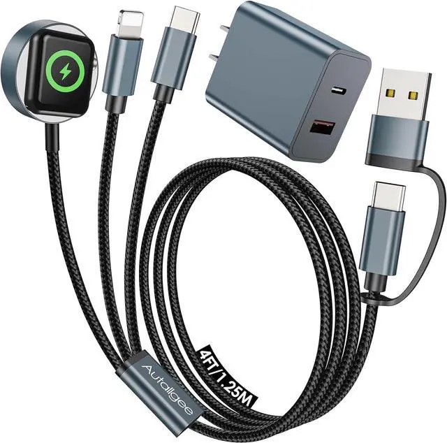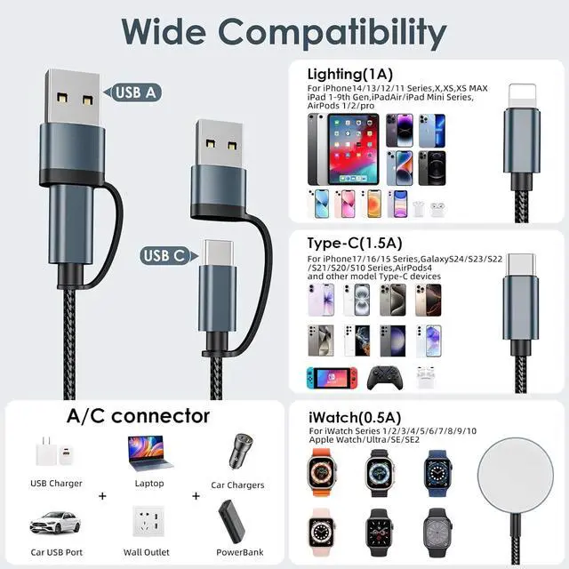 Multi-Function: Autallgee multi charging cable has 6 charging ways. What's remarkable is that it can charge three different devices simultaneously Our multiple charger cord is compatible with iWatch Ultra 2/Ultra/SE 2/SE/Series 10/9/8/7/6/5/4/3/2/1 Please note it doesn't support charge watchiPhone 17/16/15/14/13/12/11/8/7 Pro/Max/Plus Galaxy S24/S24+/S24 Ultra/S23/S22/S21/S20.?