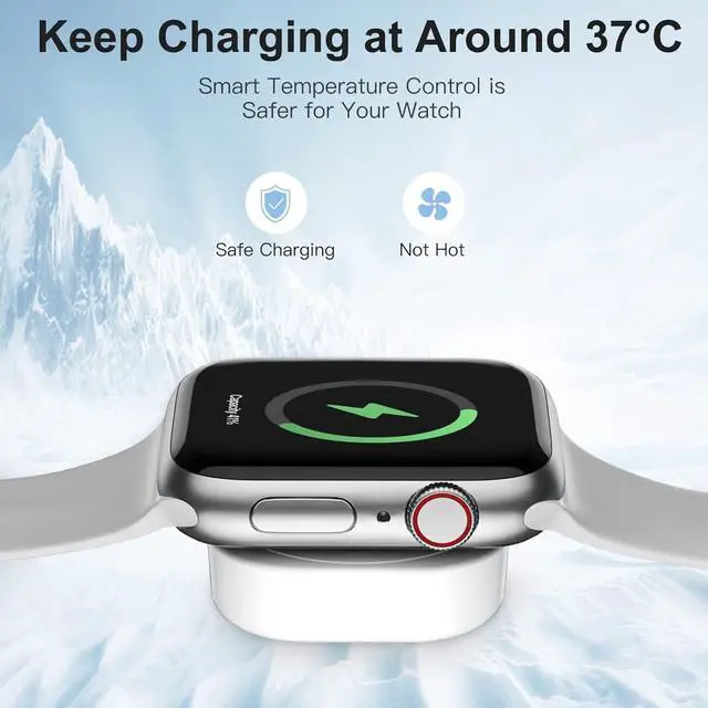 { 98.6 °F for Safer Charging } - With thousands of chip solutions and premium materials our Wireless iWatch charger achieves less power loss and maintains a 98.6 °F charging temperature. { Less Than 2.5H Faster Charging } - For a better charging experience we recommend you to use 5V/1A adapter with our iWatch charger Upgraded Compatible with Watch Charger cable provides original high-speed charging via USB-A port and fully charged in 2-3H. { 5FT Magnetic Charging Cable } - Simply hold the iWatch fast charging cord near the back of the watch where magnets cause it to snap into place automatically.