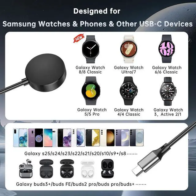Wide Compatibility: This 2-in-1 cable charger for watch is extremely compatible. It works with a wide range of Galaxy Watch models including Galaxy Watch 8 8 Classic 7 Ultra 6 Classic 6 5 Pro 5 4 Classic 4 3 Active 2 and