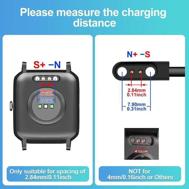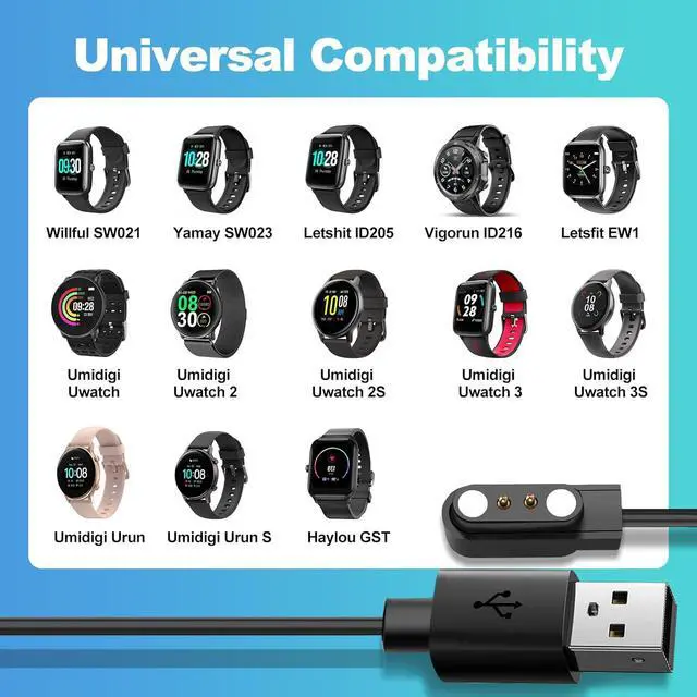 Note - Please check the device before purchasing this smart watch charger. It is only fit for watch with a distance of 2.84 mm/ 0.11 inches between the centers of two charging points and it cannot charge devices of other sizes. Wide Compatibility - Compatible model SW021 SW023 SW025 ID205L ID205G ID205U ID205S ID206 ID216 Uwatch 2/2S/3/3S/Urun/Ufit Gst smartwatch compatible with YAMAY Willful LETSCOM Lintelek Blackview Umidigi Fitpolo Wyze Skg Letsfit Cubitt Tozo. Magnetic Design Charging - Built With Strong Magnetic Charging Module Can Easily Connect To Your watch Convenient for charging the ID205L watch no Need To Worry About Suddenly Loosening When Charging.