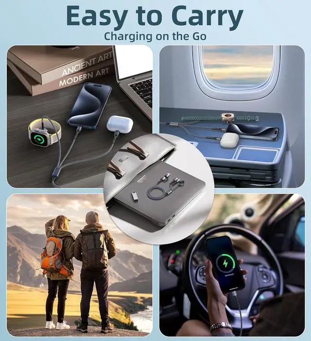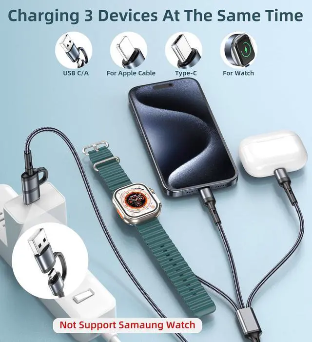 3 in 2 Multi Charging Cable DesignThere are 6 charging ways- USB C/A to iWatch charger & USB C/A to L cable & USB C/A to Type C Cable. The chargers for multiple devices support simultaneously charge 3 devices with a USB C/A adapter (included) compatible with all iWatch series 11/10/9/8/7/6/5/4/3/2/1 Ultra and SE models. The L port is compatible with iPhone 14/13/12/Pro/Max/iPad USB C is for iPhone 17/iPhone 17 Pro/iPhone Air/ iPhone 17 Pro Max/16/15 Galaxy S25/S25+/S25 Ultra/S24/S23/S22 (Galaxy Watch and laptop charging is not supported). Vacation Travel Essentials & Car AccessoriesWith lightweight and portable design this 5 feet 3-in-2 multi charging cable is fit in your travel bag take it on the go or simply use at home and office.