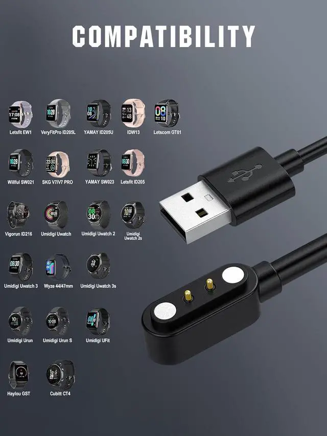 ??????????????????????: Please refer to the second picture to check the charging distance of the watch. Only suitable for spacing of 0.11 in( 2.84MM ). (Not for 0.16 in (4MM) or other distances)????????: If charging fails due to magnetic repulsion from incorrect alignment reverse the charger's direction to ensure proper polarity attraction for normal charging please refer to our video??????????????????????????: Replacement charger for SW021 SW023 SW025 ID205L ID205G ID205U ID205S ID206 ID216 Uwatch 2/2S/3/3S/Urun/Ufit Gst and other models widely suitable for YAMAY Willful Letsfit Letscom Veryfitpro Fitpolo Umidigi (Not for other smartwatch models)????????????????????????????????????: Our USB magnetic smart watch charger does not work with the following brands and models: SW022 LW11 GTX Fitness CXB01 Mugo Chalvh Dirrelo ID206mini Letsfit IW2 UMIDIGI Uwatch 5 MVEFOIT KALINCO P22 SoundPEATS Livikey Boean FVYAO Overfly Cubitt CT2Pro Fitniv IW1 AOKESI Kummel boAt Watch Xtend TOZO S2 KOSPET Noise ColorFit Pro 3 ColorFit Ultra etc.