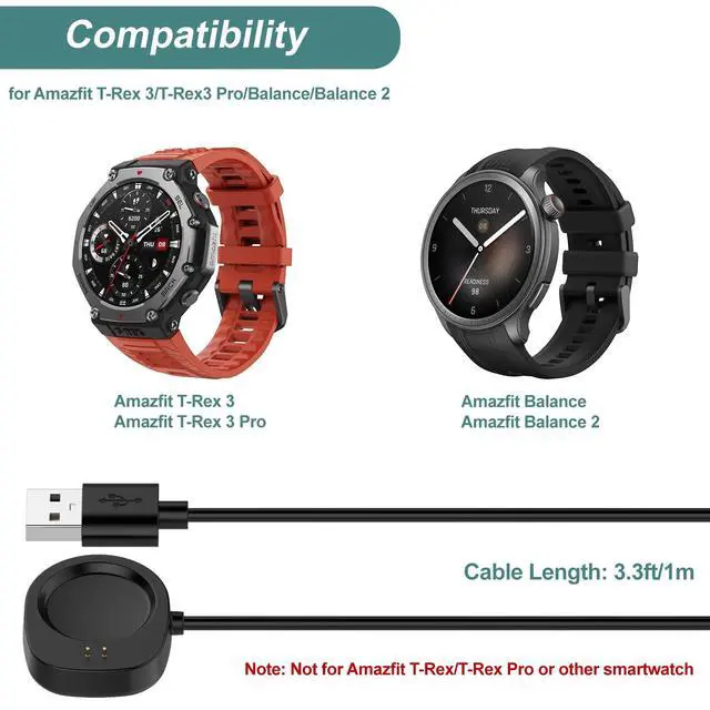 Note: Not for Amazfit T-Rex/T-Rex Pro or other smartwatchDurable & PremiumThe T-Rex 3 charger cable is made of high quality wire; provides a stable charging performance. The T-Rex 3 Pro charger cable works like the OEM charger. It is a good choice to replace lost or damaged charger cableSafe & Fast ChargingThe Balance charger build-in smart chips provides a stable charging performance and protects smart watch from over-current over-voltage or short-circuit. and it charge your watch fast a full charge takes about 2.5 hours. Convenient and Easy to UseTo get Balance 2 charging just plug it into USB port on your PC laptop notebook wall charger or car charger. Geting a better experience we suggest you to use the recommended adapter (5V 1A). ServicesIf there is any problem when using T-REX3 Charging cable just contact us and then we will offer perfect solution immediately.