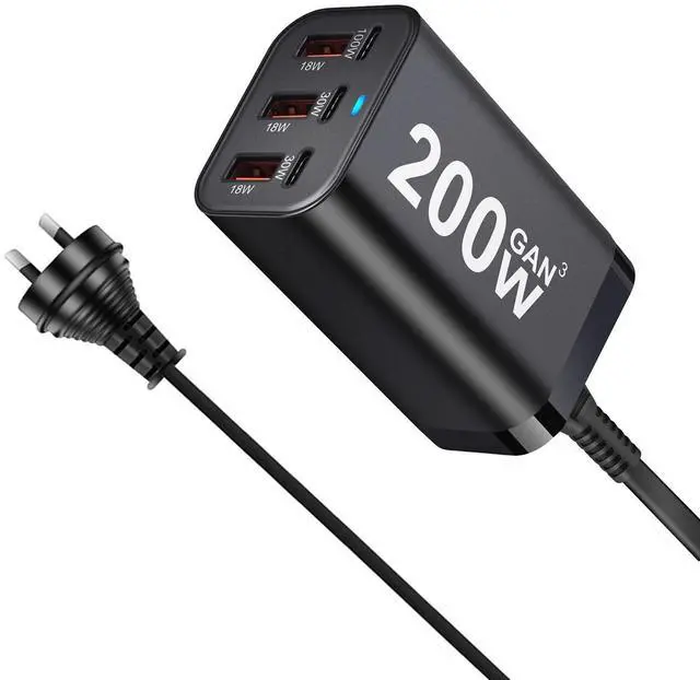 • This 200W GaN desktop charger is the ultimate solution for anyone with multiple high-power devices. It consolidates all your charging needs into a single, efficient hub, eliminating clutter and delivering fast, safe power to your laptop, phone, tablet, and more.