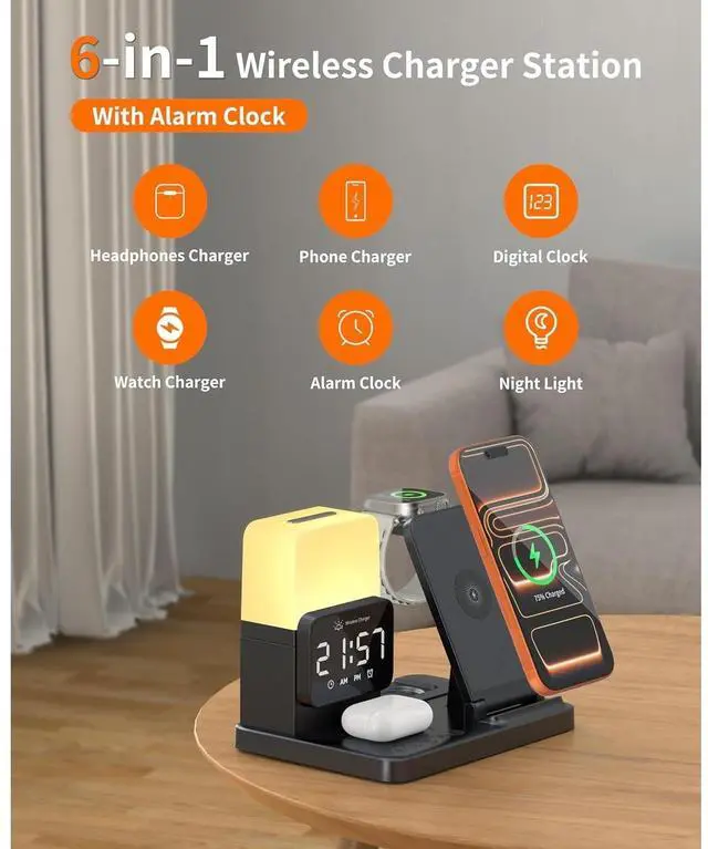 6-in-1 Wireless Charging Station: The 6-in-1 wireless charging station simultaneous. Charging for multiple devices. It can power up to three devices at once: wireless phone chargers, wireless earbuds, Apple Watch. With Alarm Clock, Digital Clock, Night Light . Engineered for efficient charging, integrating all your charging needs at home or in the office. (Note: case thickness should be less than 2mm)