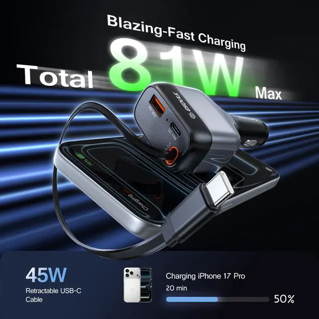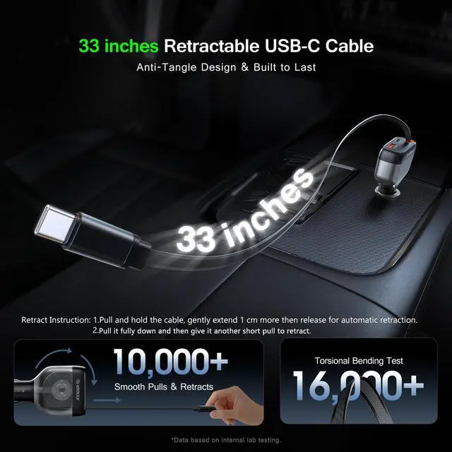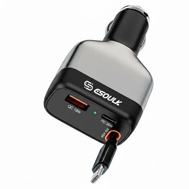 Keep your dashboard clutter-free and your devices powered with this versatile 3-in-1 Retractable Car Charger. Engineered for both speed and durability, it features a 33-inch retractable USB-C cable that supports up to 45W Max output, making it powerful enough to charge smartphones and tablets alike. The cable is designed to withstand the rigors of daily use, boasting a lifespan of over 10, 000 pulls and 16, 000 torsional bends. Beyond the built-in cable, the charger includes a dedicated 36W PD USB-C port and an 18W QC USB-A port, allowing you to charge three devices simultaneously.