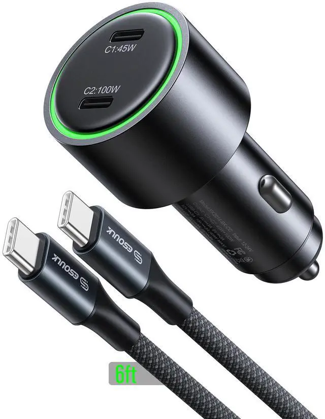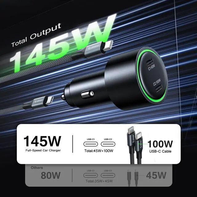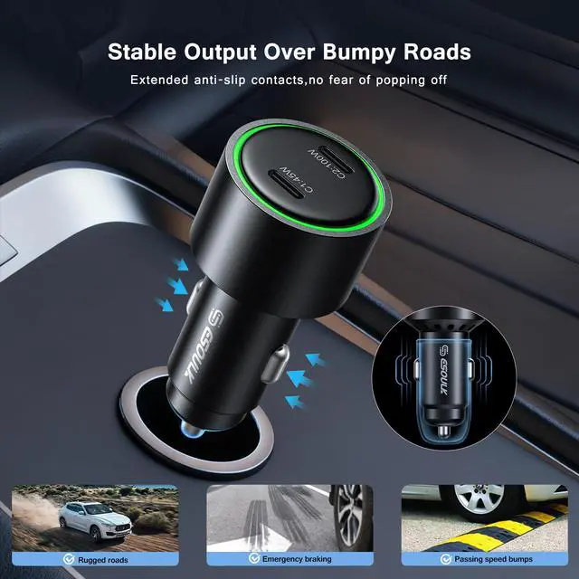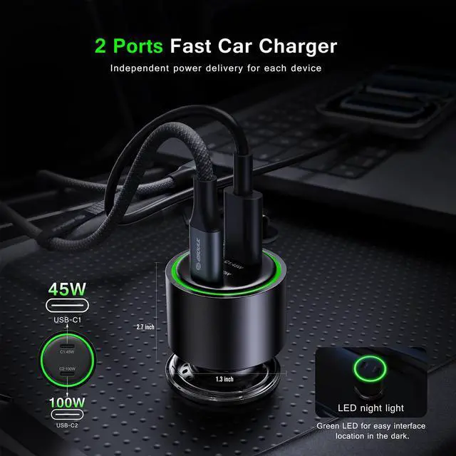 USB-C ports: a 45W USB-C1 port and a high-capacity 100W USB-C2 port. To ensure effortless use during night drives, it includes a built-in green LED night light ring that allows for easy interface location in the dark. With its robust power output and thoughtful design, this charger provides a reliable and rapid charging solution for laptops, tablets, and smartphones while on the road.