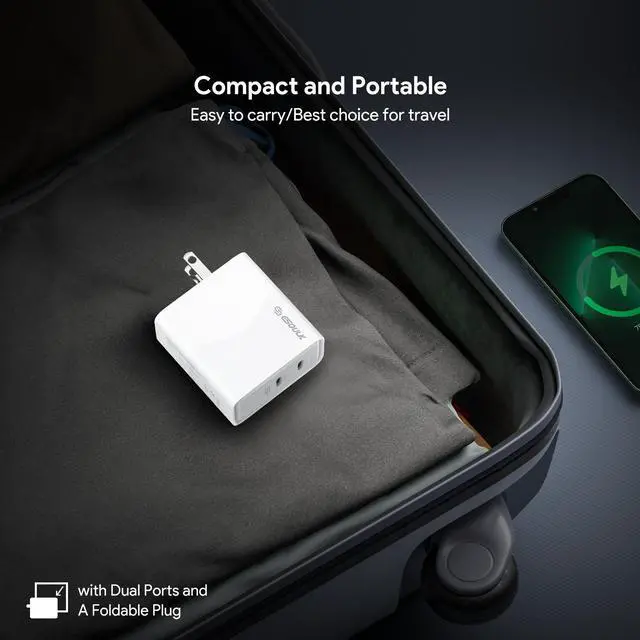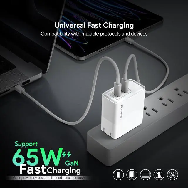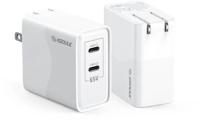 The Esoulk 65W Fast Charge Wall Charger is a powerful and efficient charging solution designed to meet the needs of modern tech users. With dual USB-C ports, this charger allows you to power up multiple devices simultaneously with high-speed charging capabilities, making it perfect for home, office, and travel use.