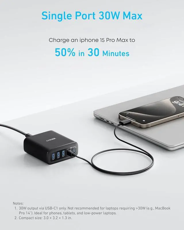 Maximum Power Minimum Time: Efficiently power your MacBook Air to 50% in just 1 hour 40 minutes or quickly boost your iPhone 16 Pro Max from 0 - 50% in 30 minutes with a single 30W max charging port.