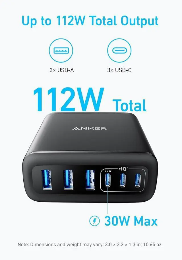 112W Multi-Device Charger: Equipped with 3 USB-C and 3 USB-A ports (112W total across 6 ports).