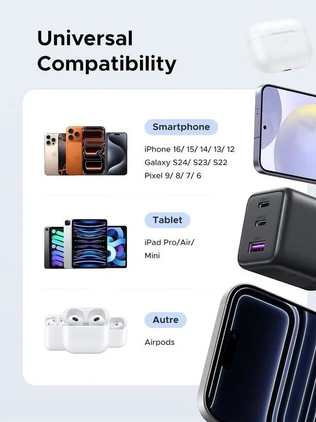 Wide Compatibility: This GaN charger works with a wide range of popular devices for iPhone 178 series Galaxy S25S21 and Note series Pixel 107 series iPads (mini and Pro) and more. Supports PD QC and PPS fast charging for safe and efficient power delivery.