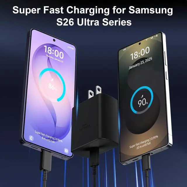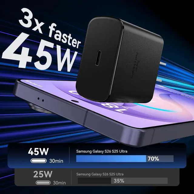 Super fast chagring only for Galaxy S25 Ultra/S25+/S24 Ultra/S24+/S23 Ultra/S23+. Only can be standard charging for Galaxy S25 /S24/S23/S22/S21. Superior Safe for Charger Fast Charging Cord This 45W type c charger fast charging cord multiple built-in safeguards protects your devices against damage caused by short circuit over-current over-voltage over-heating and over-charging issues. Automatically stops charging when battery capacity is full to ensure your device safety and longevity. What You Get 2*45W USB C Fast Charger Blocks 2* 10FT extra long for type c charger fast charging cord. If you have any questions or concerns please do not hesitate to contact us.