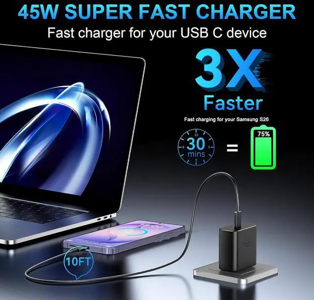 Type C Charger Fast Charging CordType C charger fast charging cord with maximum power of 45 Watt for Super Fast Charger block capability uses Power Delivery technology to provides the most efficient charging power. For Super fast chagring only for Galaxy S26 Ultra/S26+/S25 Ultra/S25+/S24 Ultra/S24+/S23 Ultra/S23+. Only can be standard charging for Galaxy S26/S25/S24/S23/S22/S 21.10FT Type C Charger Fast ChargingThe 45W for USB C fast charger is equipped with extra longer 10FT Type C to C cable offering a user-friendly reversible design and longer charging distance fast charging and up to 480 Mbps data transfer speed. The power output up to 5 Amp and 100-240 volt input of this 2pack for charger fast charging can charge two devices simultaneously ideal for worldwide travel with your partners! 45W for Charger Compatibility The 45W USB C fast charger is perfect to charge for iPhone 17/iPhone 17 Pro Max/iPhone 17/iPhone Air//iPhone 16/15 Pro Max/for Galaxy S26 Ultra/S26/S26+/S25 Ultra/S25+/S25/S24 Ultra/S24/S24+/S23 Ultra/S23/S23+/ S22/S22+/S22 Ultra etc.