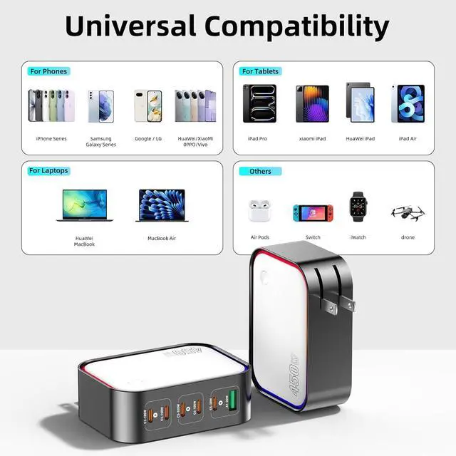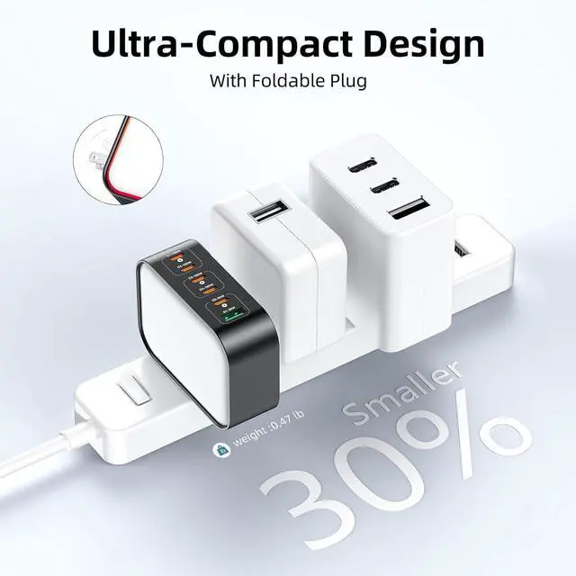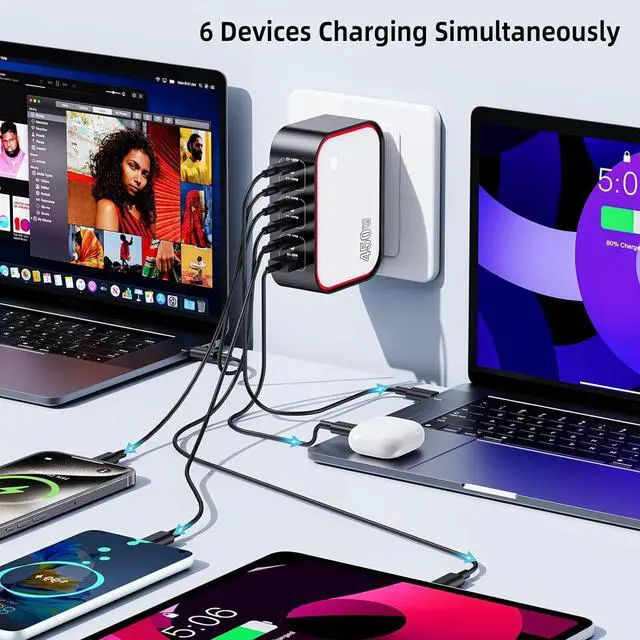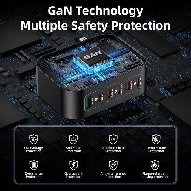 (Tip: Use E-marker certified cables for optimal performance. )Powerful GaN II Fast Charging TechnologyThis usb c charging station utilizes advanced GaN II technology to deliver high-speed charging in a compact portable design. When using a single port it can charge your phone from 0% to 70% in under 45 minutes and your laptop from 0% to 60% in just 40 minutes. It's 30% smaller and lighter than other chargers easily fits in your pocket. making it exceptionally convenient for both office use and travel. Wide CompatibilityPower wall charger Compatible with Smartphone Tablet and Laptop Compatible for MacBook Pro 13/ MacBook Pro MacBook Air MacBook and Compatible with iPhone 17 Pro Max/Air/16 SE/16 15 Pro max /Galaxy S25+/ S21/ XPS 15/ 13 Google Pixel iPad Pro 12.9 / iPad Pro 10.5 / iPad Pro 11/ iPad Mini Series/ iPad Air Series Pro etc. Safe Smart Charging ProtectionThis usb charger intelligently identifies devices through advanced PD/QC protocols and incorporates a multi-layered safety system. It precisely regulates temperature and voltage in real time to effectively prevent overheating and power surges. As the device nears full charge it automatically switches to a gentle trickle charging mode carefully balancing the battery state to safeguard long-term health and maximize lifespan.