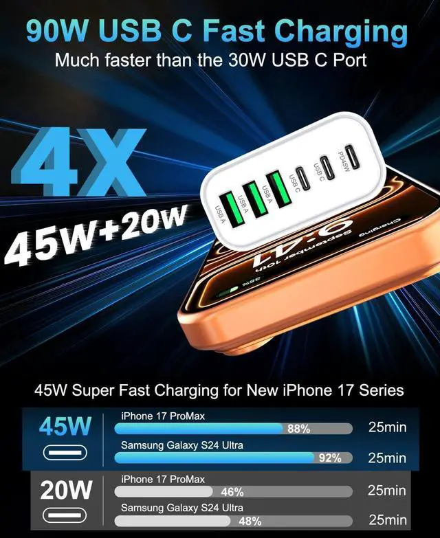 Upgraded 45W Laptop Charger The USB C Charger supports the Power Delivery and Quick Charge 3.0 fast charging functions with a total power of up to 90W. Equipped with 45W USB-C ports this 90W GaN fast wall charger can charge two devices simultaneously at full speed perfect for powering your IPhone 17/16/15 Pro Max and MacBook Air at the same time. The USB-A port offers an output power of 3 A/5V while the USB-C port offers a charging speed of 45W. Charge your IPhone devices from 0% to 60% in just 30 minutes? 6 in 1 Fast Charging USB C Charger BlockUpgraded USB C Charger Block charge IPhone series models up to 3X faster than original 5W Charger.
