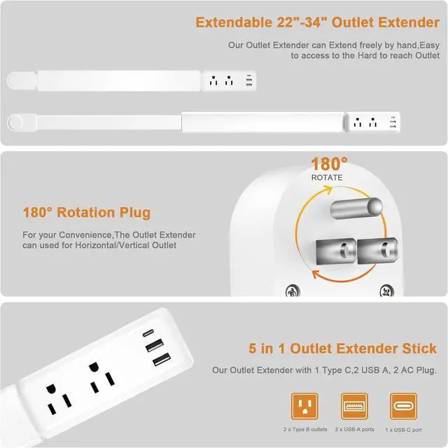 Reach & Rotate: This electrical outlet extender extends from 22 to 34 inches and the plug head rotates 180 degrees. As a flexible outlet extender stick it allows you to easily access outlets hidden behind heavy furniture like sofas beds and nightstands without moving them. 2.