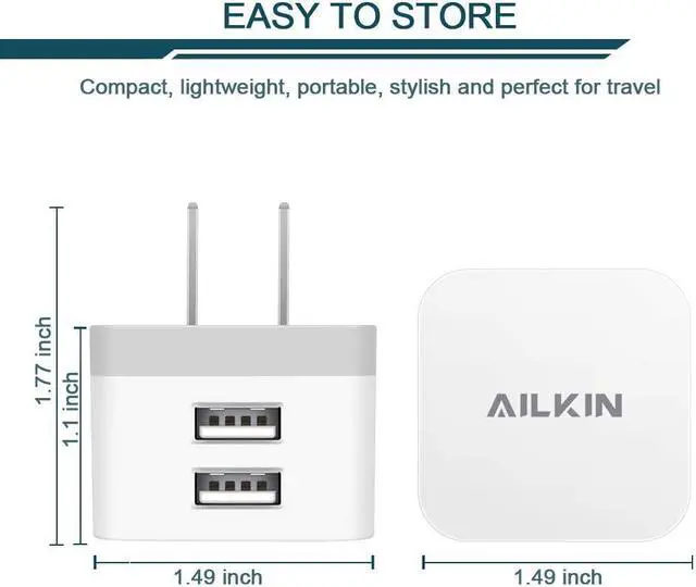 [Stable Design] -Upgrade- wall block is designed to be thin and Flat making the charger more stable when plugged into the outlet than a standard charger. Plug pins and USB ports are at 90-degree angles instead of straight out. Free to worry about the kids & pets running into charging cords. Easy to reach wall sockets behind furniture. [Highly Adaptable] - AILKIN square charger adapter connects all USB A port cables to mobile phones & tablets. Applies to iPhone 17/16/15/15 Pro/15 Pro Max/15 Plus/14 Pro Max 14Pro 14 13 Pro Max 13Pro 13 Mini 13 12 Pro Max 12Pro 12 Mini 12 SE 11Pro Max 11 Pro XR XS MAX XS X 8 Plus Galaxy S25 S24 S23 S22 S21 Ultra 5G S21+ S20 S10E S10 Plus S9 Plus S8+ S7 Edge J8 J7 Note 20 10 9 A14 A13 A12 A03S A51 A71 A72 5G Google 10 9 8 7 Pro 6 Pro 5a 5 4A 4XL Moto Kindle etc.