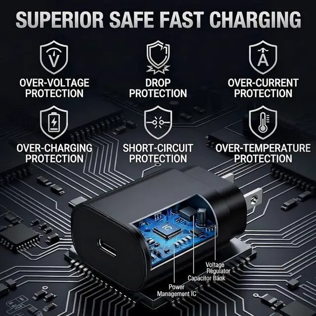 Charging Block: Engineered with multi-layer safety protection this USB C charger block fully complies with international safety standards to prevent overcharging overloading short circuits and overheating. Advanced built-in safeguardsincluding smart IC chip technologyintelligently detect your devices power needs and regulate voltage and current in real time ensuring stable and secure charging every time. Universal Type C