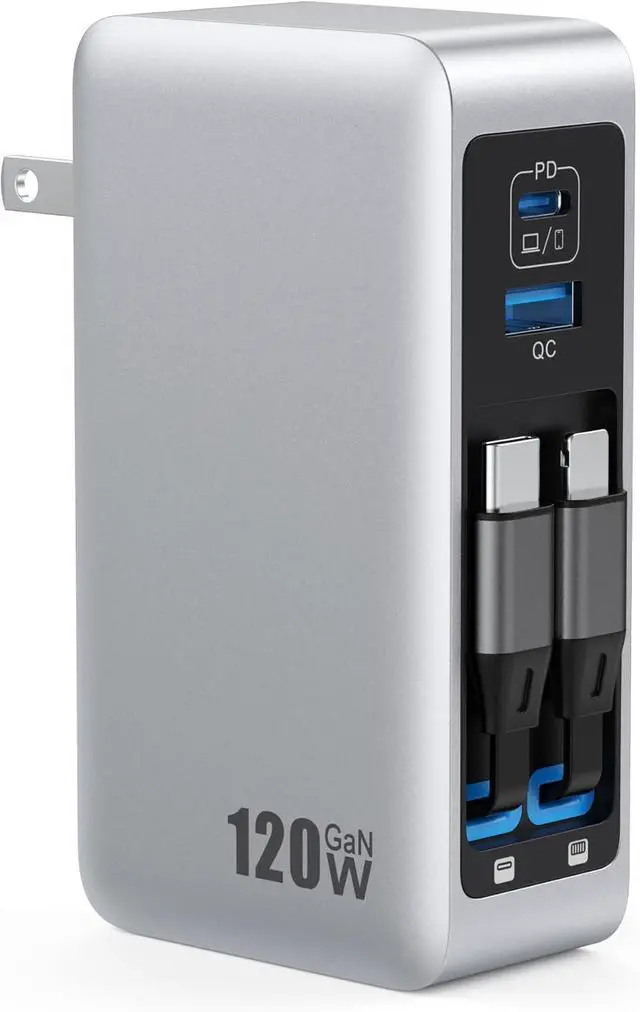 All-in-One Design with 2 Built-in Retractable CablesEliminate messy cords! The mini retractable cable tucks neatly into the charger and features a fold-able plug and compact design making it easy to carry and storeperfect for maintaining a clutter-free desk and for travel. Charge Easier With ReelReel Charger offers an extended reach for enhanced flexibility. Pull the durable cable up to 27.56 inches (70 cm) for convenient use across desks beds or airport seats. It retracts smoothly when not in use preventing pet chewing and ensuring safety. 120W Multi-Port ChargerThis device supports powering 4 devices simultaneously using its own cable and USB port.