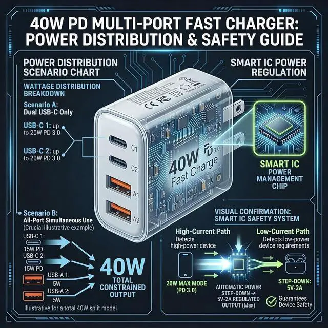 Devices Simultaneously: Maximize your outlets with this 40W total output multiport charger (2 USB-C 2 USB-A). The 20W PD USB-C ports fast-charge compatible devices like the iPhone 16 from 0-50% in just 30 minutes while intelligent power allocation ensures all connected tech charges safely and efficiently. 40W Total Output