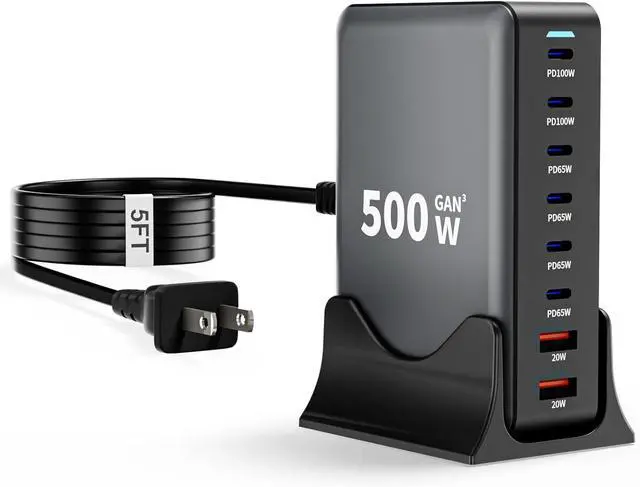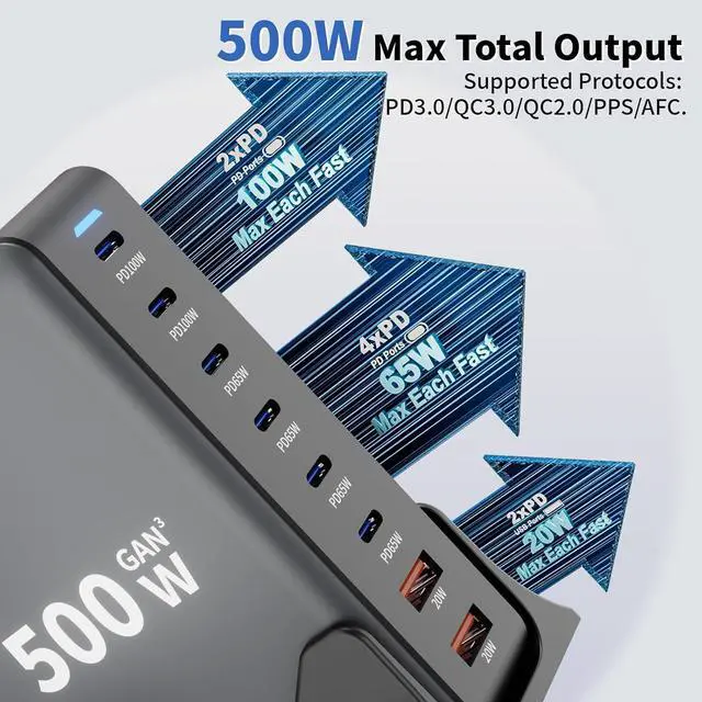 8-in-1 USB C Charging StationThe 500W USB C Wall Charger features 6 x USB C ports and 2 x USB A ports for powering phones tablets headphones smartwatches game consoles and more. experience the convenience of high-capacity charging No need to wait you can quickly charge up to 8 devices at the same time and each port intelligently distributes power to ensure you get optimal charging efficiency! Upgraded Dual PD 100W Fast-Speed ChargingThe USB C HUB Brick USB-C1/C2 ports support advanced 2 x PD/PPS 100W fast charger ports 4 x PD/PPS 65W and 2 x QC20W fast charger ports to charge multiple devices simultaneously.